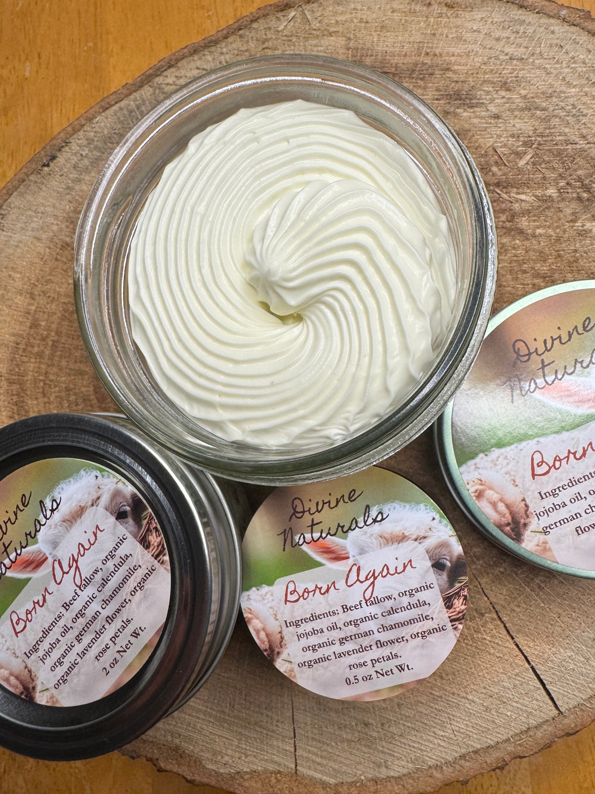 Ingredients: Beef tallow, organic jojoba oil, organic calendula, organic German chamomile, organic lavender flower, and organic rose petals.