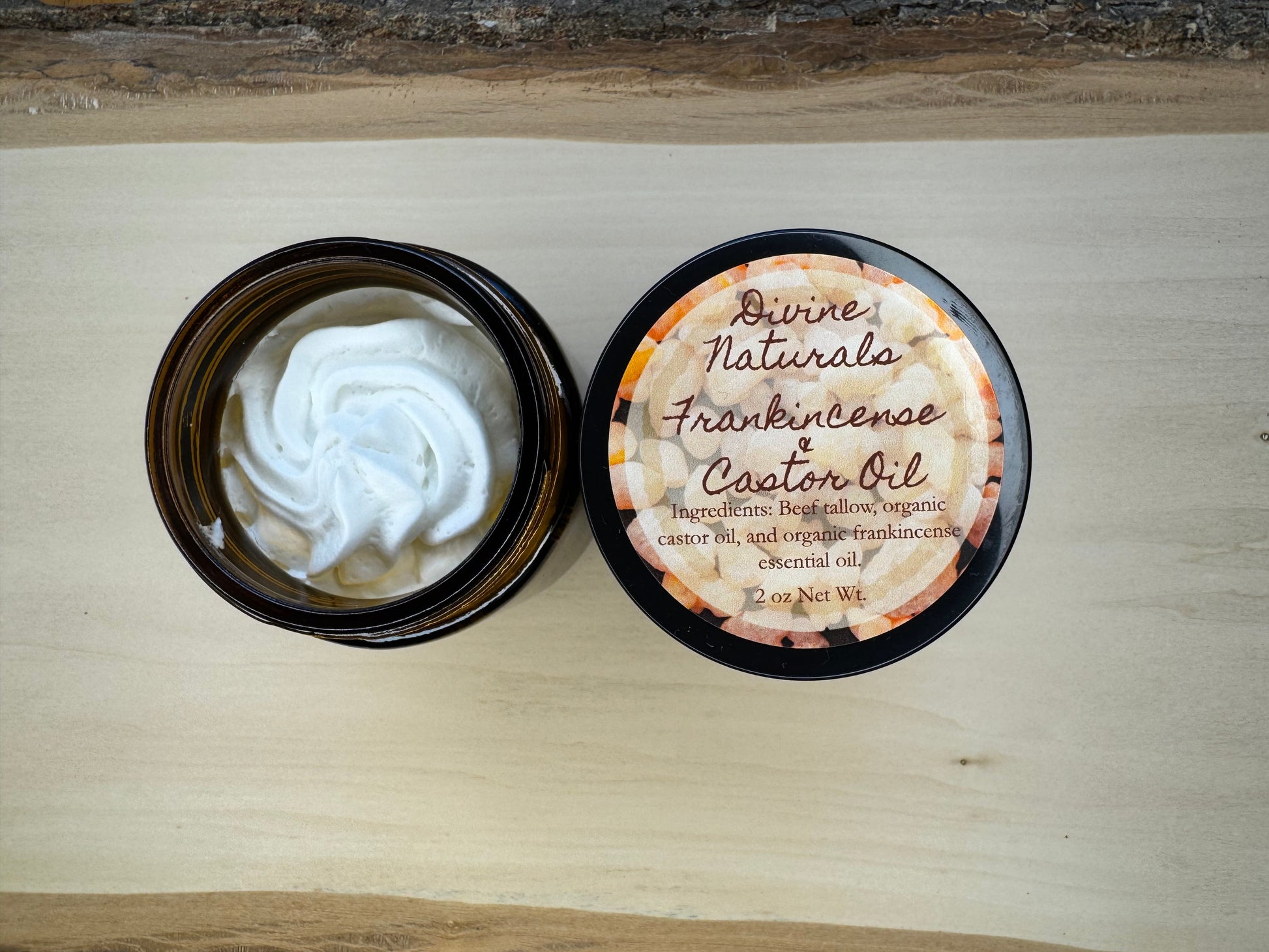 Ingredients: Beef tallow, organic castor oil, and organic frankincense essential oil.