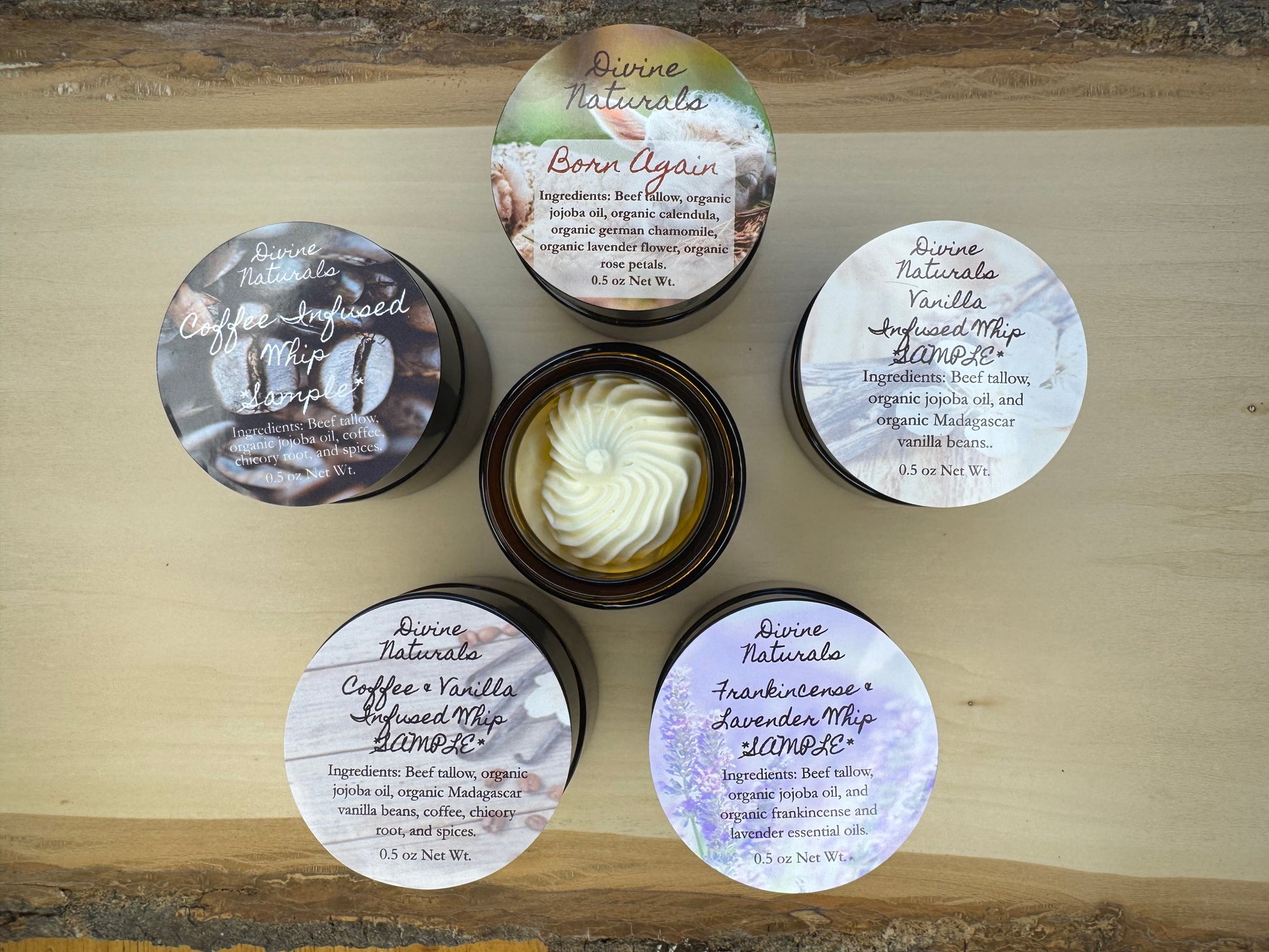 Samples Included: Coffee Infused, Vanilla Infused, Coffee & Vanilla Infused, Frankincense & Lavender, and Born Again